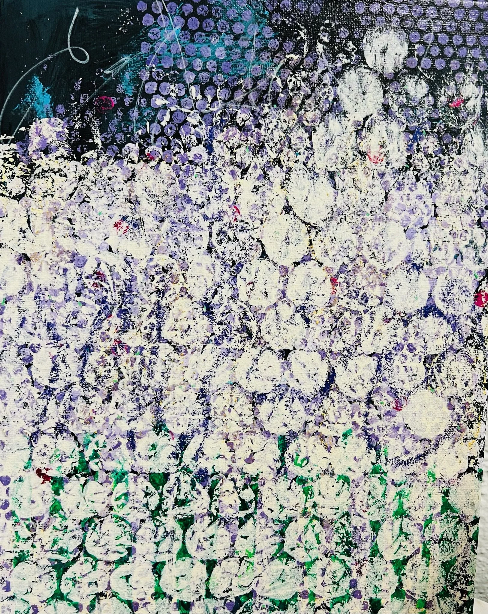 When starting a new piece, I always being with mark-making using many different tools and objects, sometimes with my eyes closed. This practice excites and frees me to explore my next steps. Following my instinct in applying my first layers of color, molding paste, or other materials is accompanied by music and movement and joy. I work in many layers to give each piece depth and space for me to carve back, revealing areas previously covered up. These close-up details are what I am drawn to in paintings and in people.